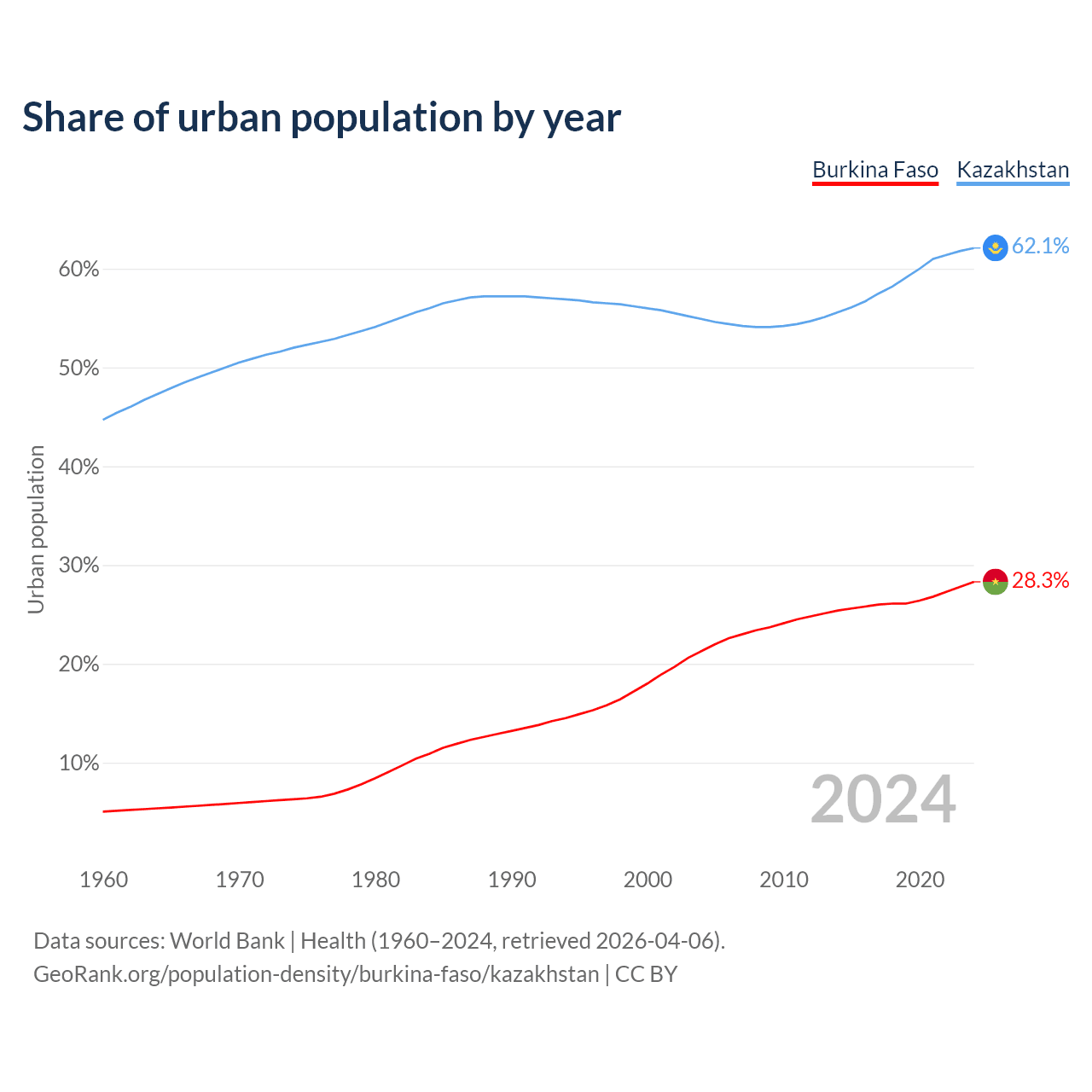 From 2006 to 2026, population density in Burkina Faso increased by 71.2%, compared to a 31% growth in Kazakhstan.
