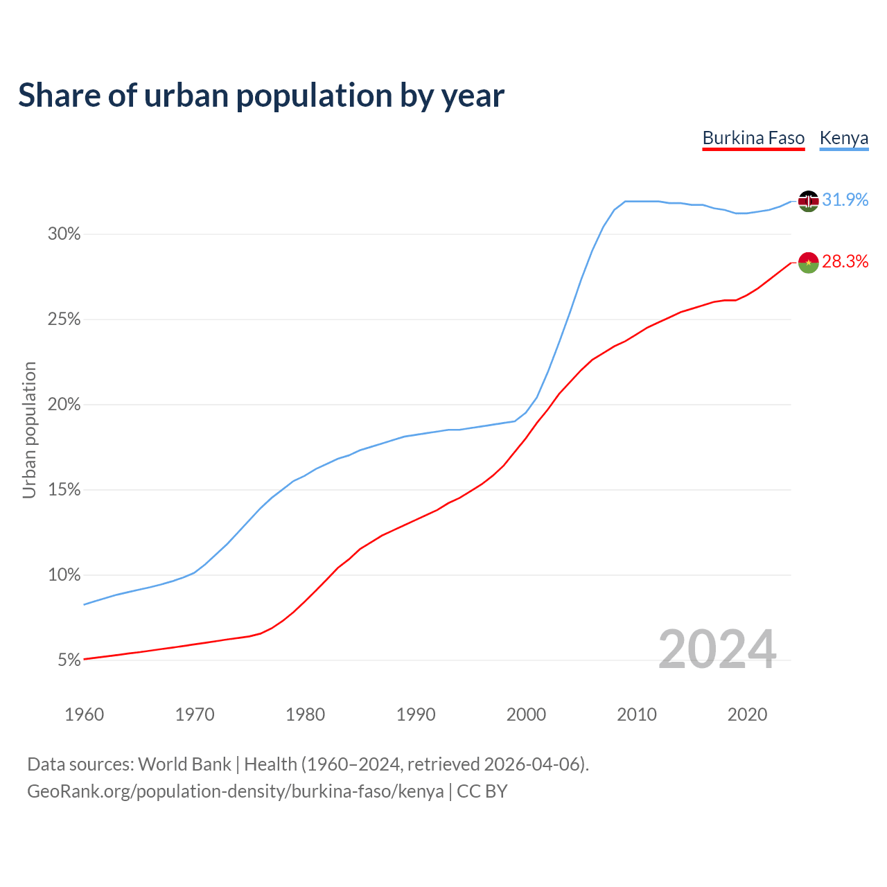 From 2004 to 2024, the share of urban population changed from 21.3% to 28.3% in Burkina Faso and from 25.4% to 31.9% in Kenya.