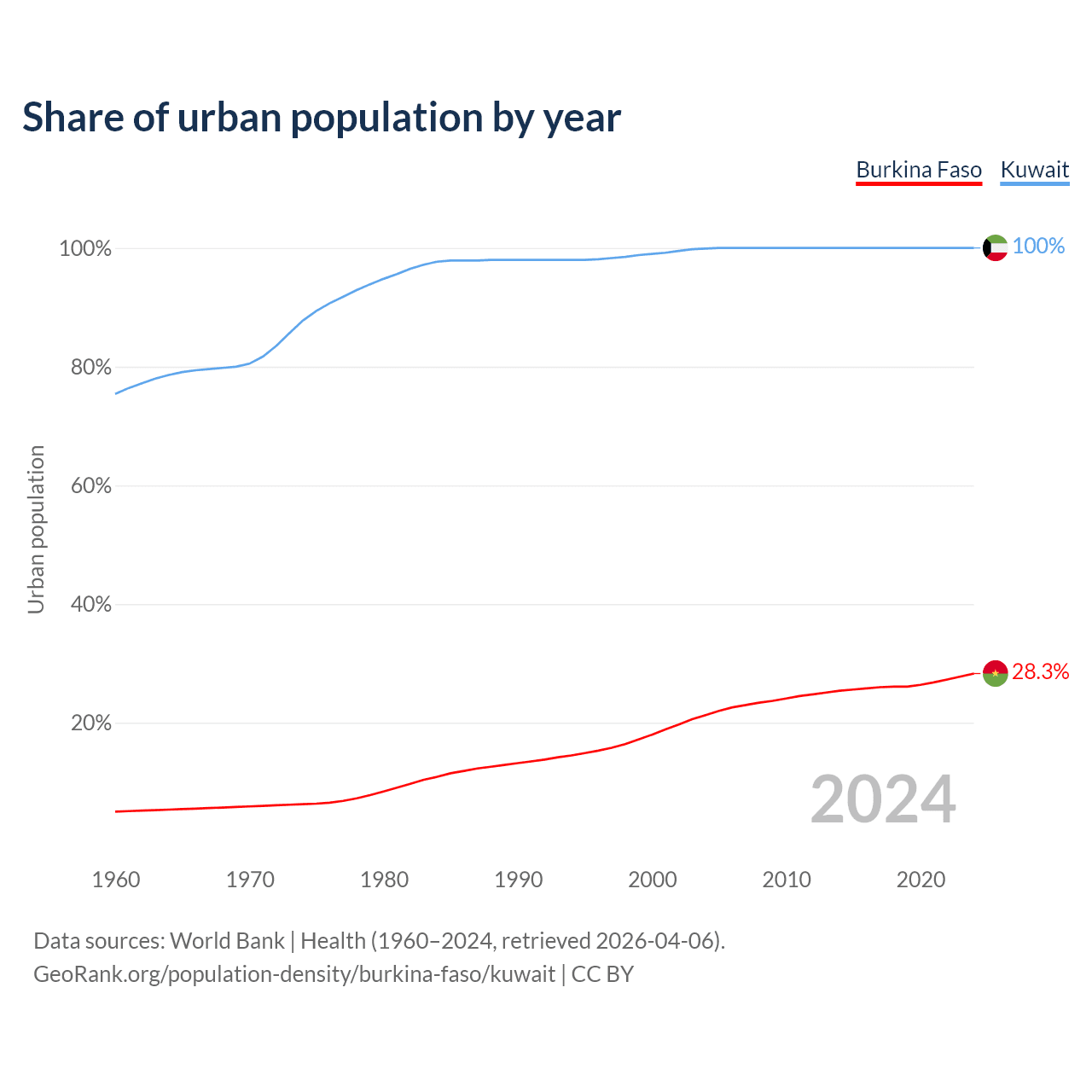 From 2004 to 2024, the share of urban population changed from 21.3% to 28.3% in Burkina Faso and from 99.9% to 100% in Kuwait.