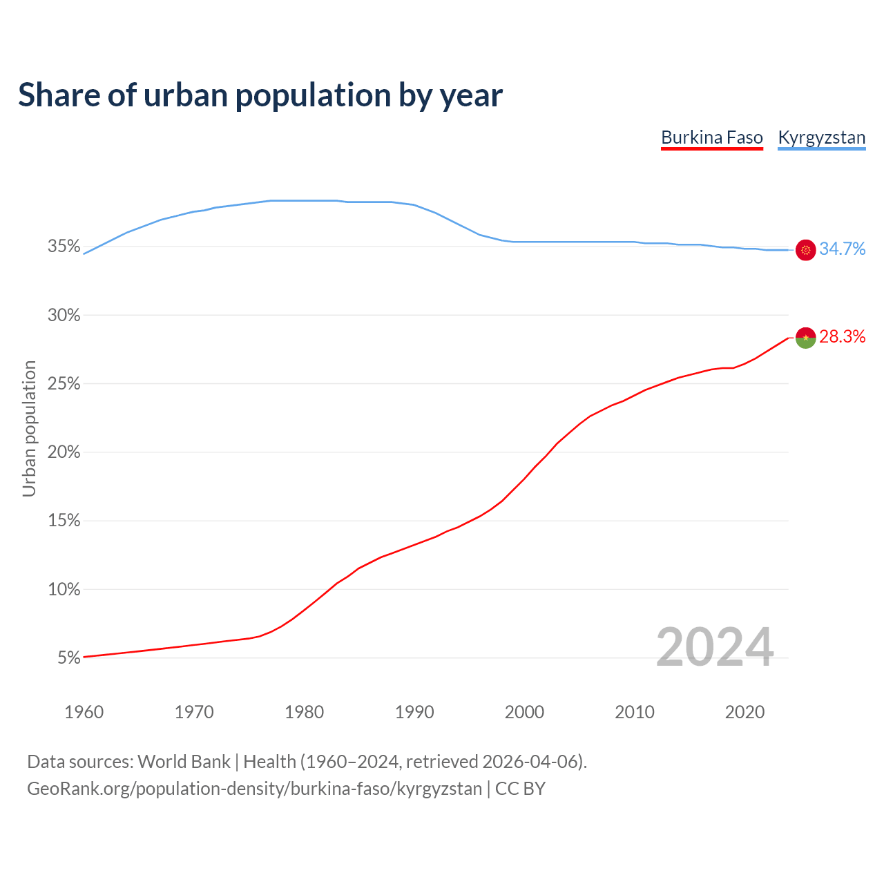 From 2004 to 2024, the share of urban population changed from 21.3% to 28.3% in Burkina Faso and from 35.3% to 34.7% in Kyrgyzstan.