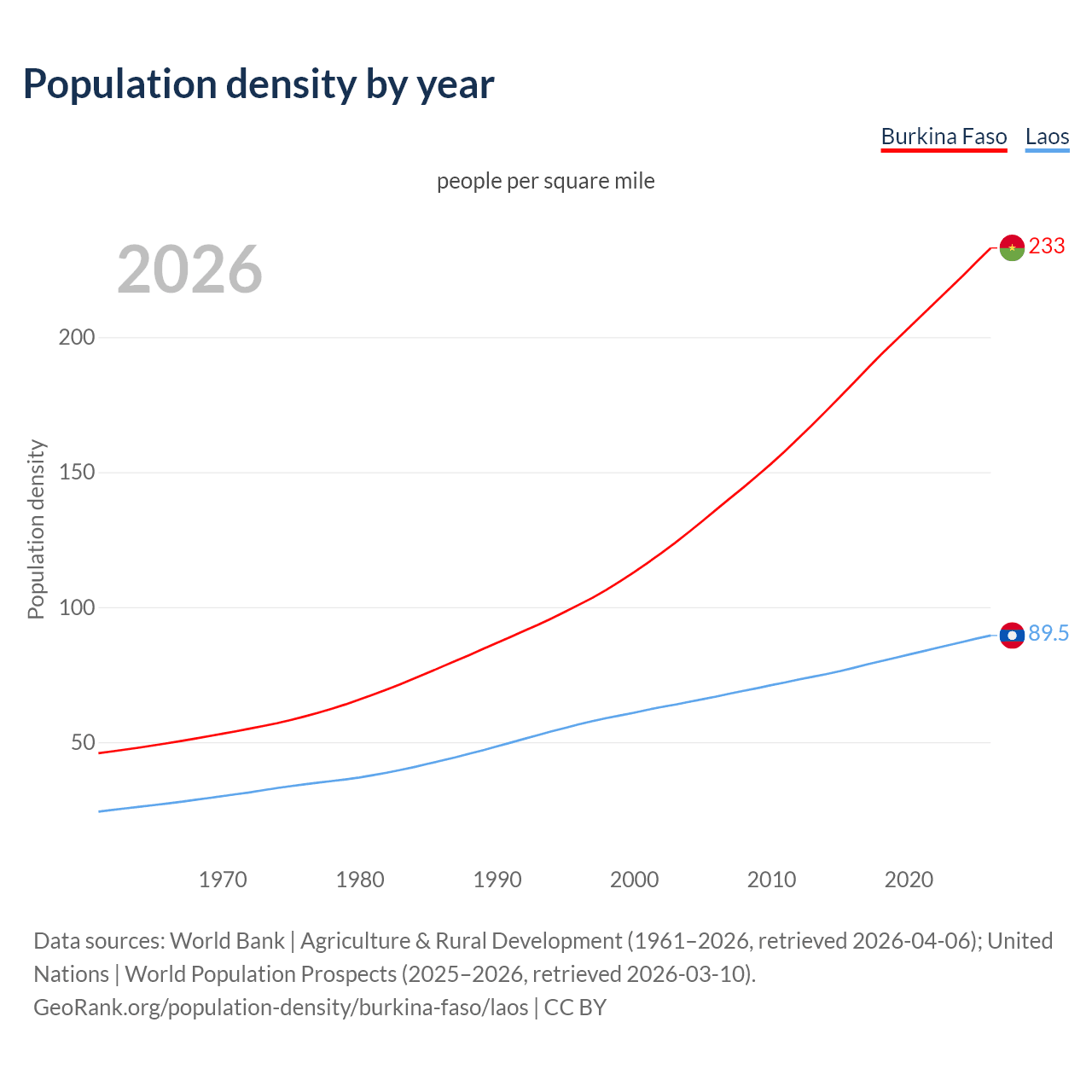From 2006 to 2026, population density in Burkina Faso increased by 71.2%, compared to a 33.8% growth in Laos.