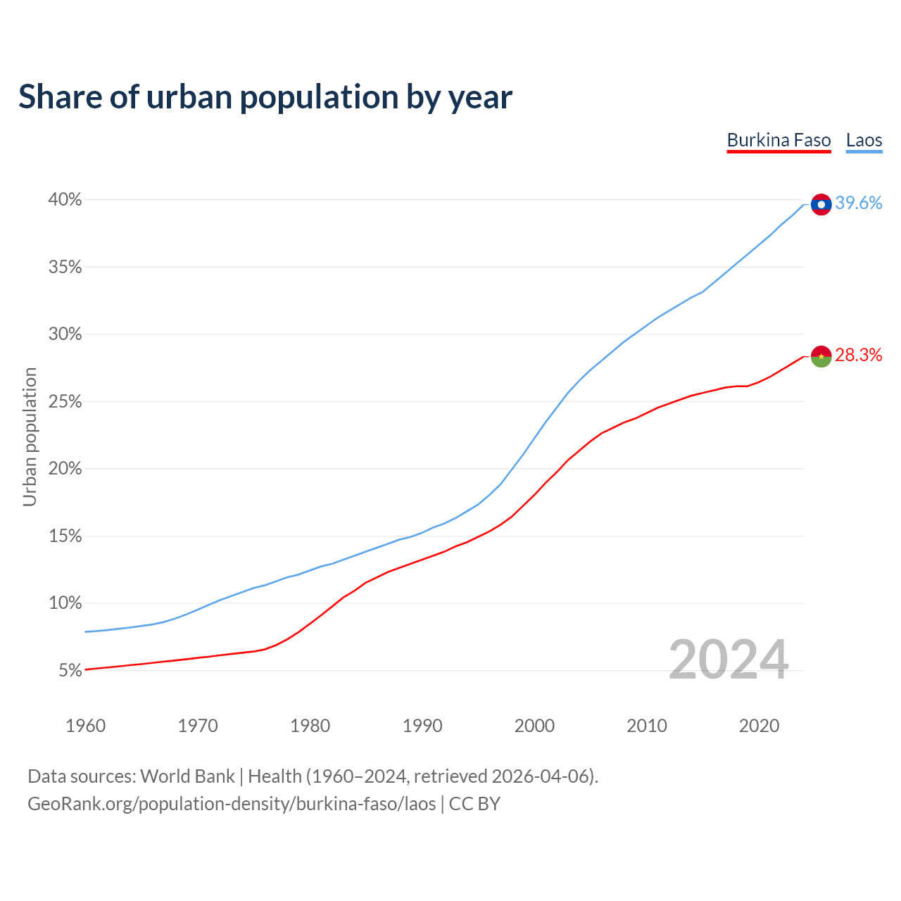 From 2004 to 2024, the share of urban population changed from 21.3% to 28.3% in Burkina Faso and from 26.5% to 39.6% in Laos.
