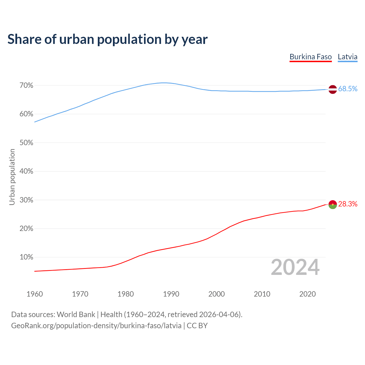 From 2006 to 2026, population density in Burkina Faso increased by 71.2%, compared to a 17.5% decline in Latvia.