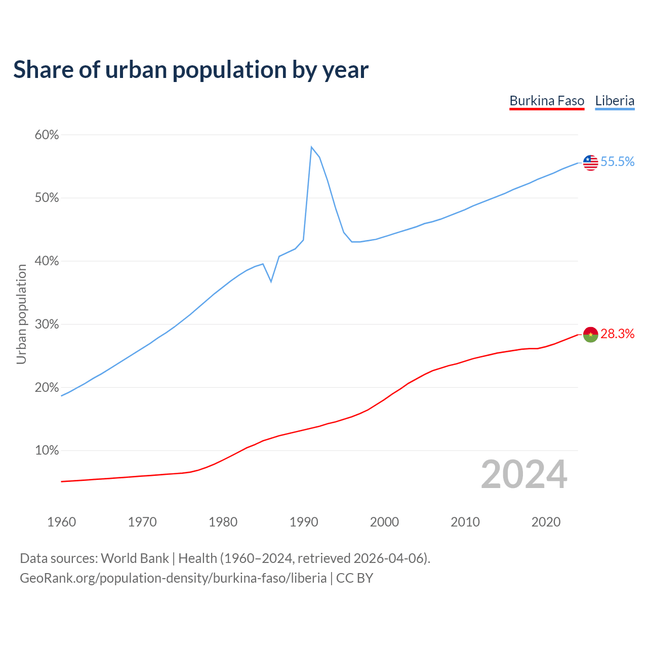 From 2004 to 2024, the share of urban population changed from 21.3% to 28.3% in Burkina Faso and from 45.4% to 55.5% in Liberia.