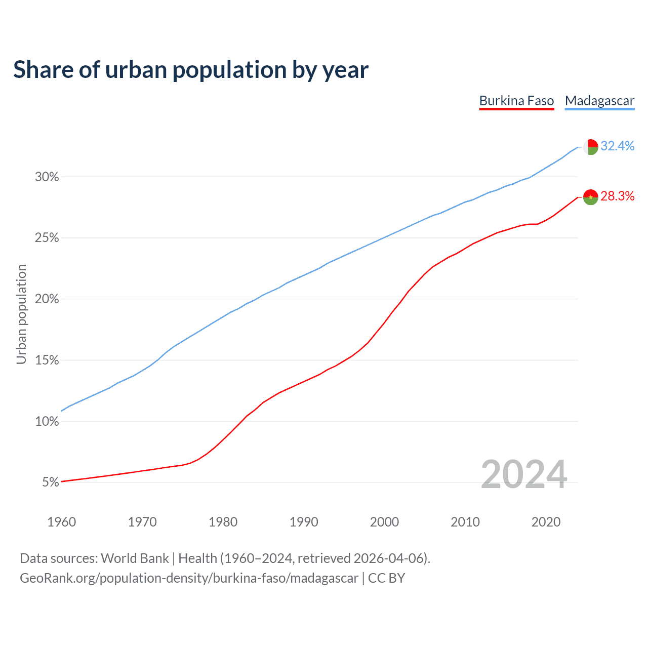 From 2004 to 2024, the share of urban population changed from 21.3% to 28.3% in Burkina Faso and from 26.2% to 32.4% in Madagascar.