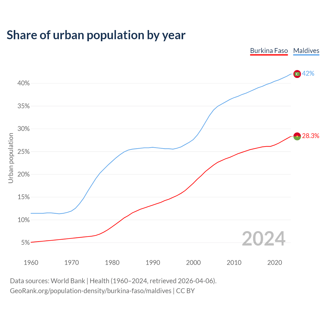 From 2006 to 2026, population density in Burkina Faso increased by 71.2%, compared to a 70.5% growth in Maldives.