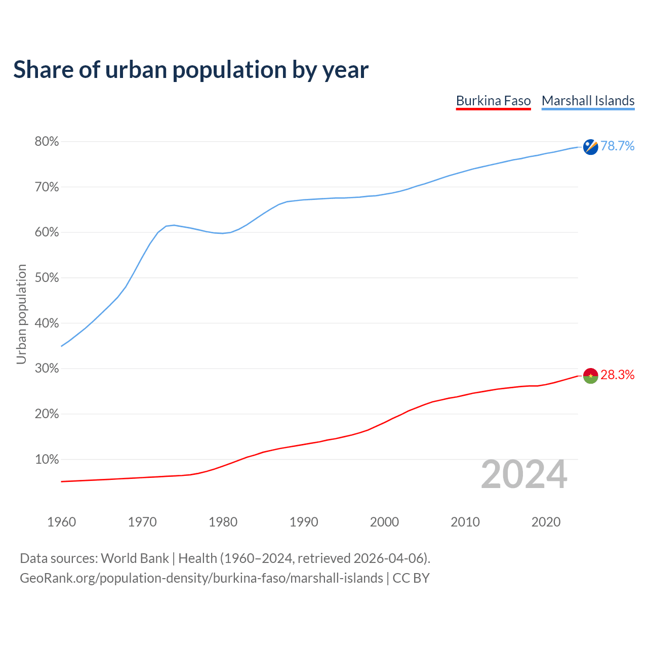 From 2004 to 2024, the share of urban population changed from 21.3% to 28.3% in Burkina Faso and from 70.1% to 78.7% in the Marshall Islands.
