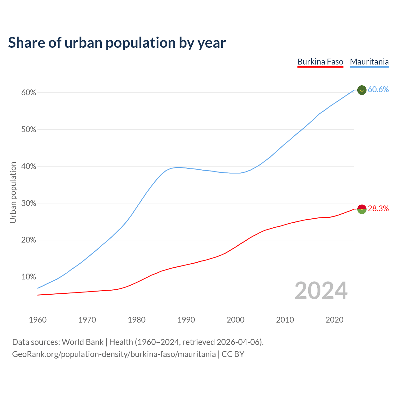 From 2004 to 2024, the share of urban population changed from 21.3% to 28.3% in Burkina Faso and from 39.6% to 60.6% in Mauritania.