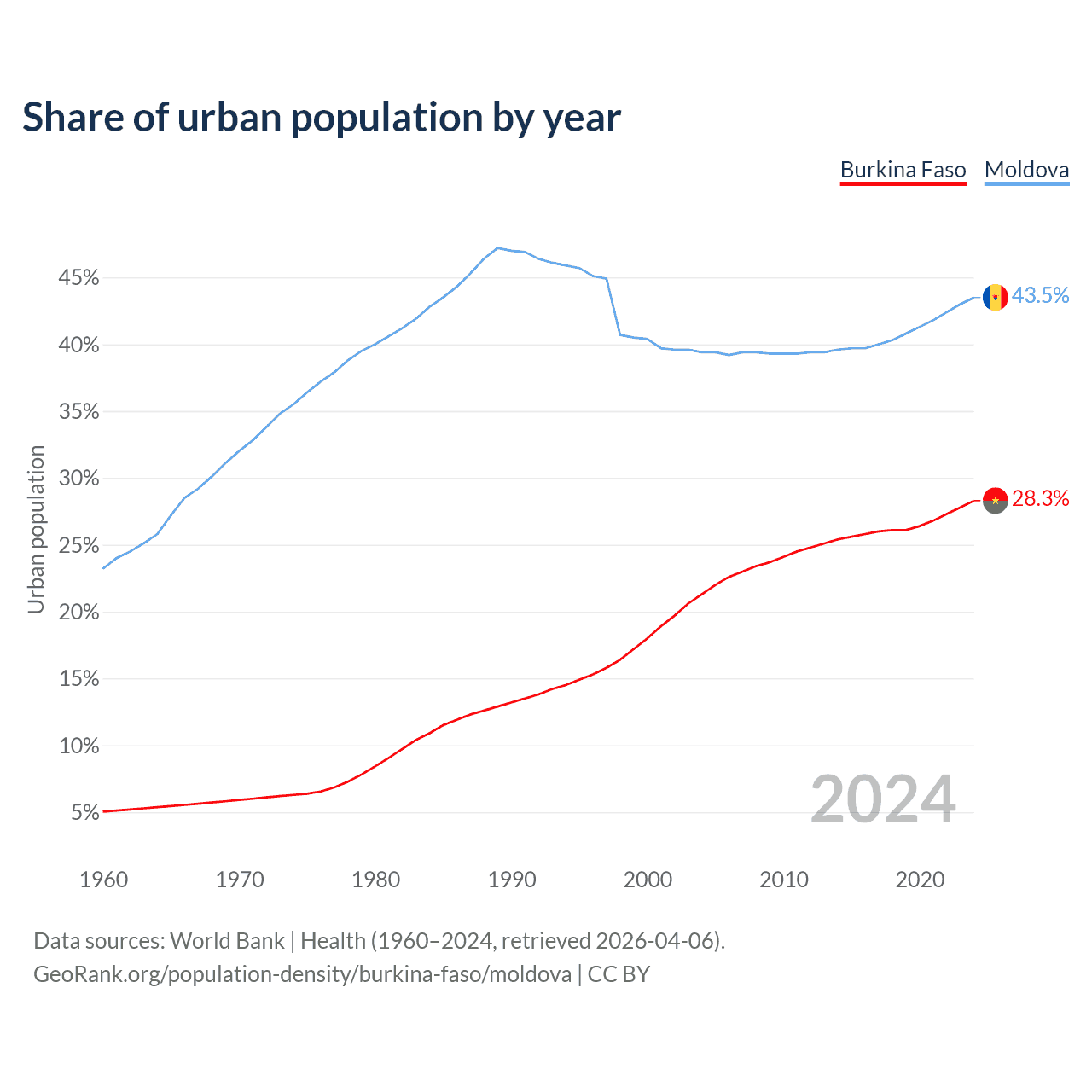 From 2006 to 2026, population density in Burkina Faso increased by 71.2%, compared to a 18.8% decline in Moldova.