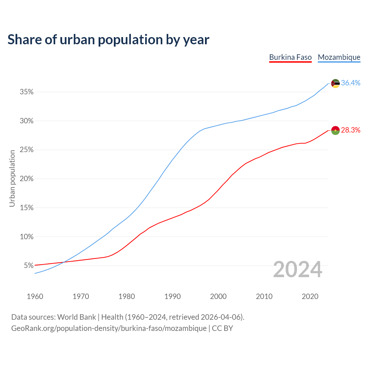 From 2004 to 2024, the share of urban population changed from 21.3% to 28.3% in Burkina Faso and from 29.9% to 36.4% in Mozambique.