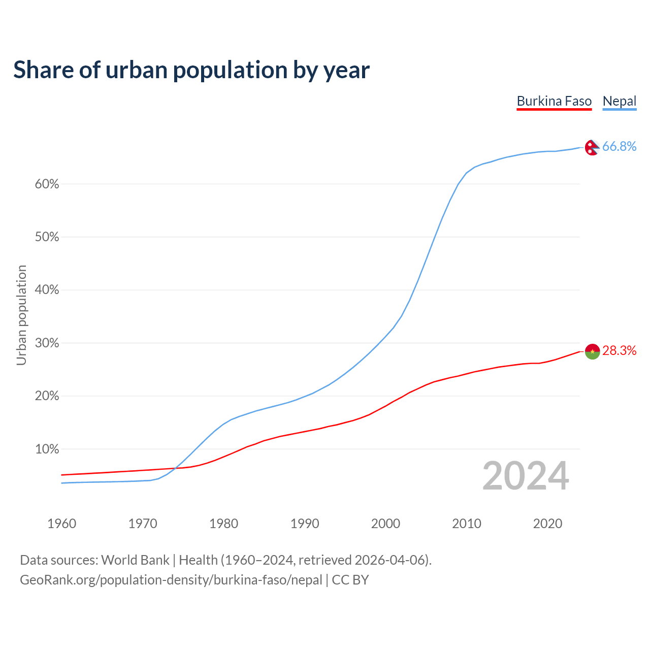 From 2004 to 2024, the share of urban population changed from 21.3% to 28.3% in Burkina Faso and from 41.6% to 66.8% in Nepal.