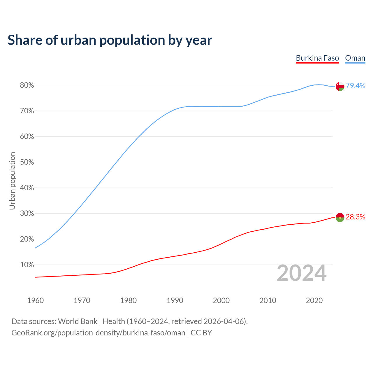 From 2004 to 2024, the share of urban population changed from 21.3% to 28.3% in Burkina Faso and from 71.5% to 79.4% in Oman.