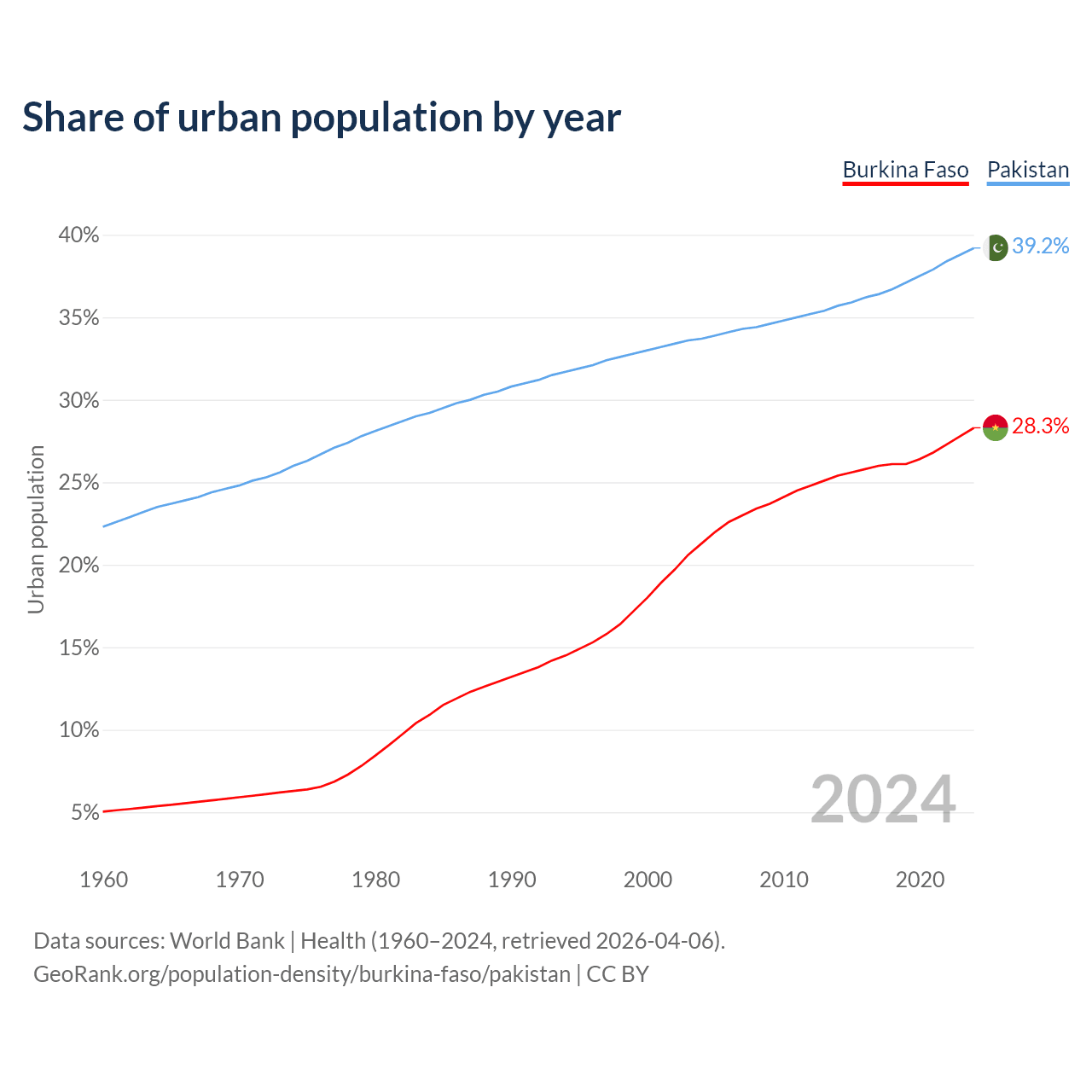 From 2004 to 2024, the share of urban population changed from 21.3% to 28.3% in Burkina Faso and from 33.7% to 39.2% in Pakistan.