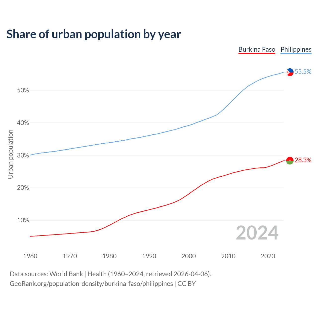 From 2004 to 2024, the share of urban population changed from 21.3% to 28.3% in Burkina Faso and from 40.9% to 55.5% in the Philippines.