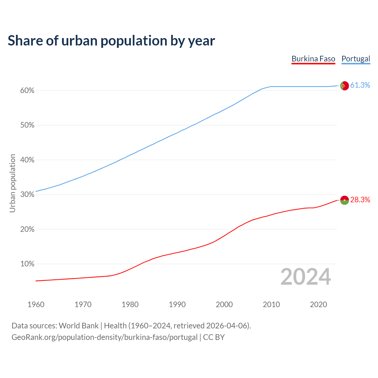 From 2006 to 2026, population density in Burkina Faso increased by 71.2%, compared to a 1.23% growth in Portugal.