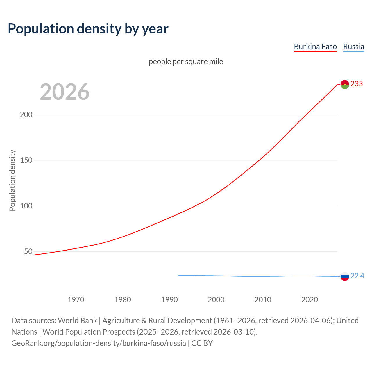 From 2006 to 2026, population density in Burkina Faso increased by 71.2%, compared to a 0.79% decline in Russia.