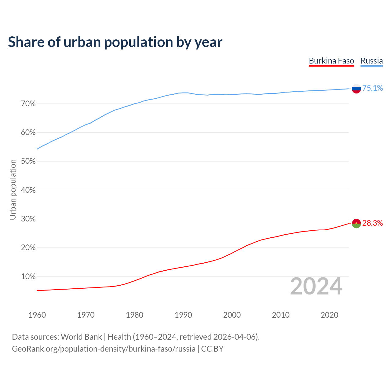From 2004 to 2024, the share of urban population changed from 21.3% to 28.3% in Burkina Faso and from 73.3% to 75.1% in Russia.