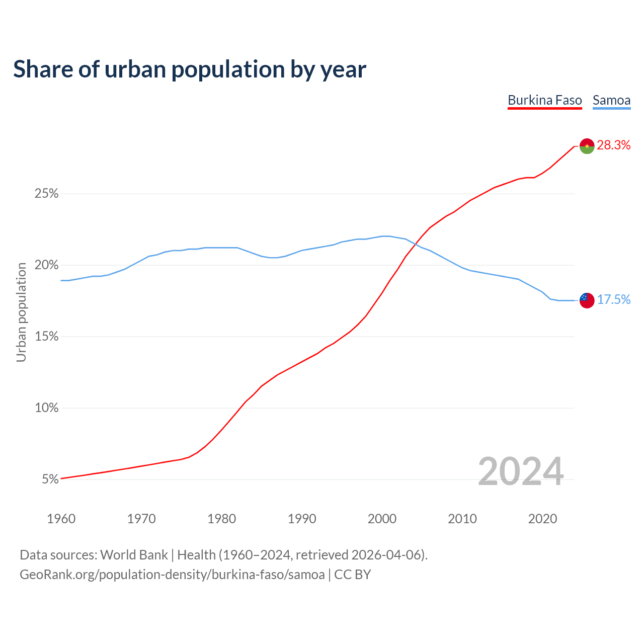 From 2006 to 2026, population density in Burkina Faso increased by 71.2%, compared to a 19.6% growth in Samoa.