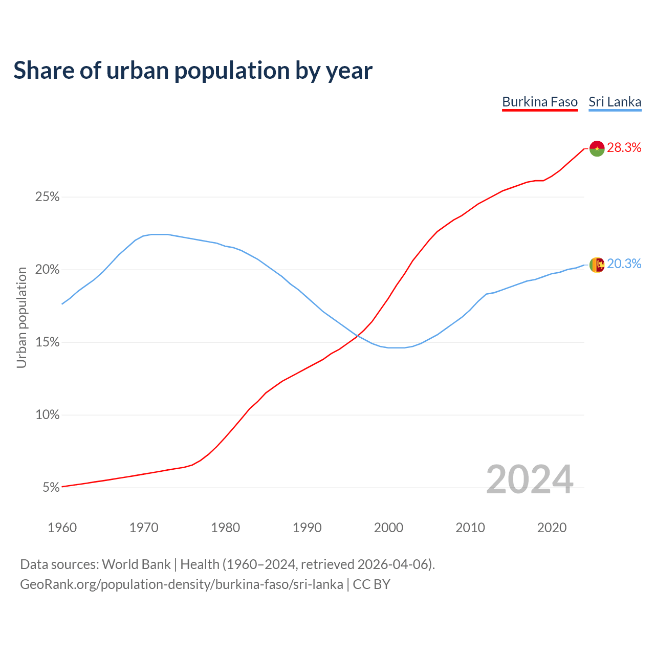 From 2006 to 2026, population density in Burkina Faso increased by 71.2%, compared to a 10.4% growth in Sri Lanka.