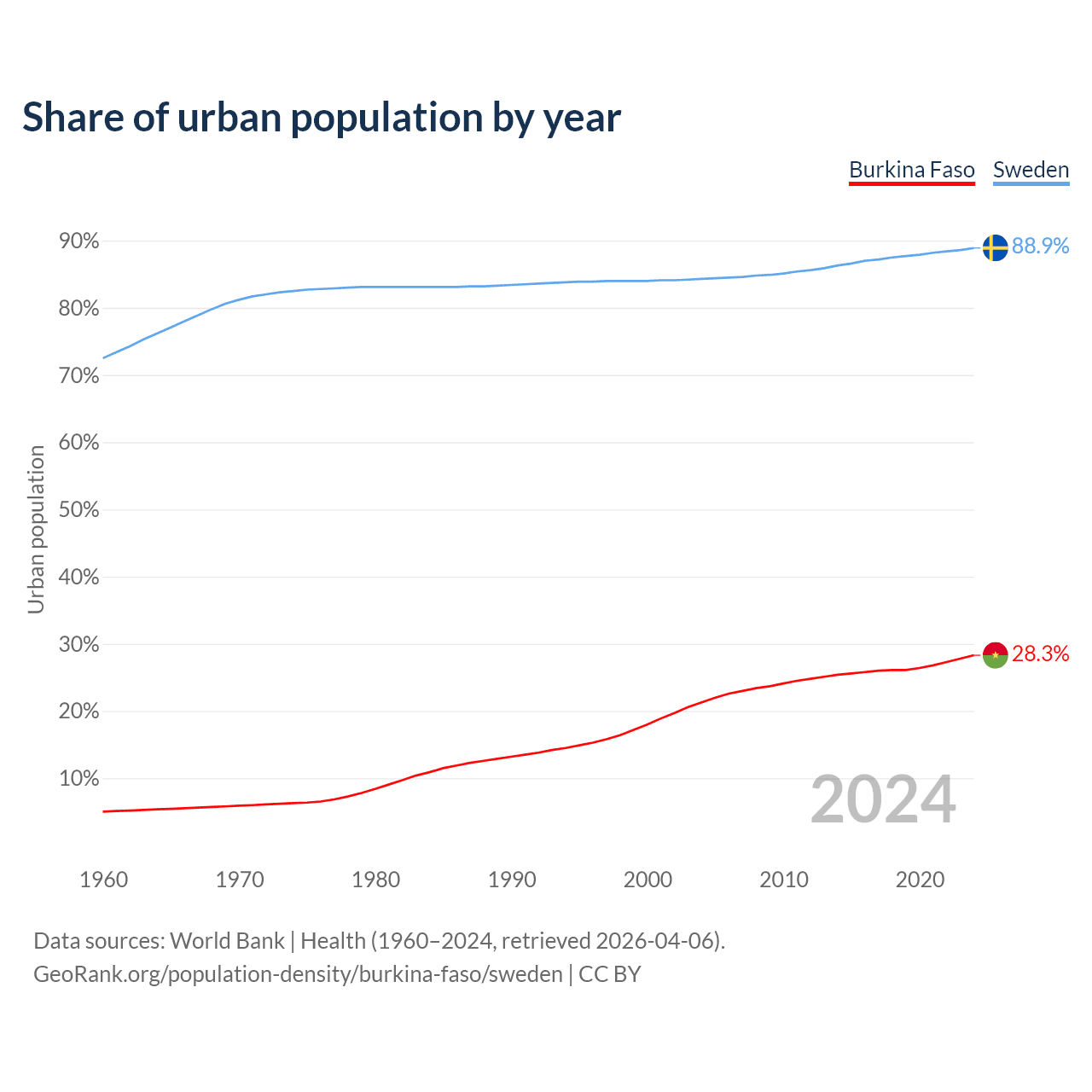 From 2004 to 2024, the share of urban population changed from 21.3% to 28.3% in Burkina Faso and from 84.3% to 88.9% in Sweden.