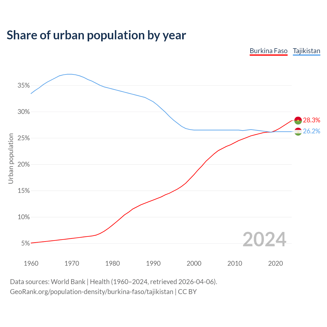 From 2004 to 2024, the share of urban population changed from 21.3% to 28.3% in Burkina Faso and from 26.5% to 26.2% in Tajikistan.