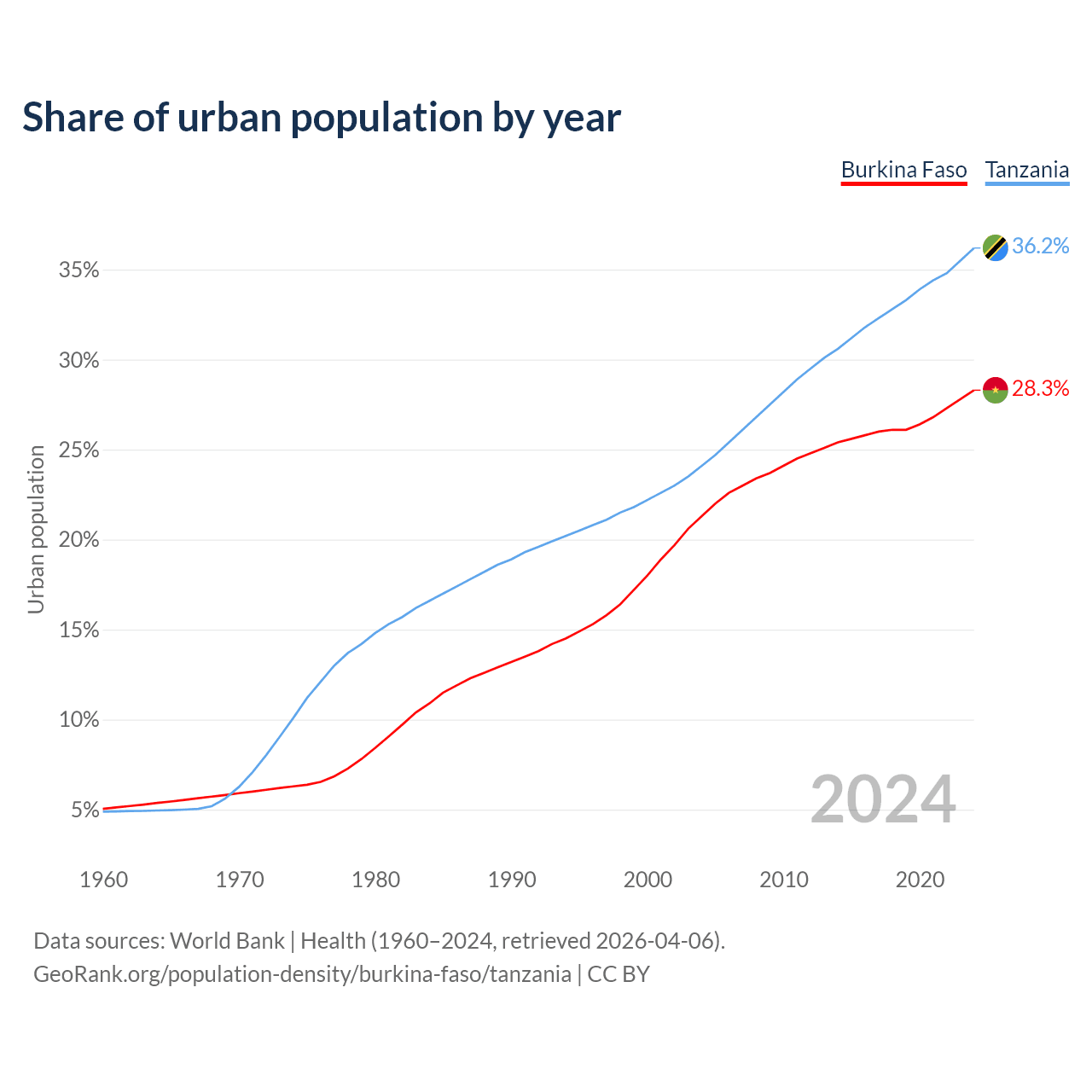 From 2004 to 2024, the share of urban population changed from 21.3% to 28.3% in Burkina Faso and from 24.1% to 36.2% in Tanzania.