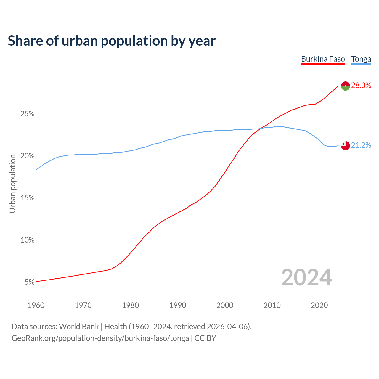 From 2006 to 2026, population density in Burkina Faso increased by 71.2%, compared to a 2.77% decline in Tonga.