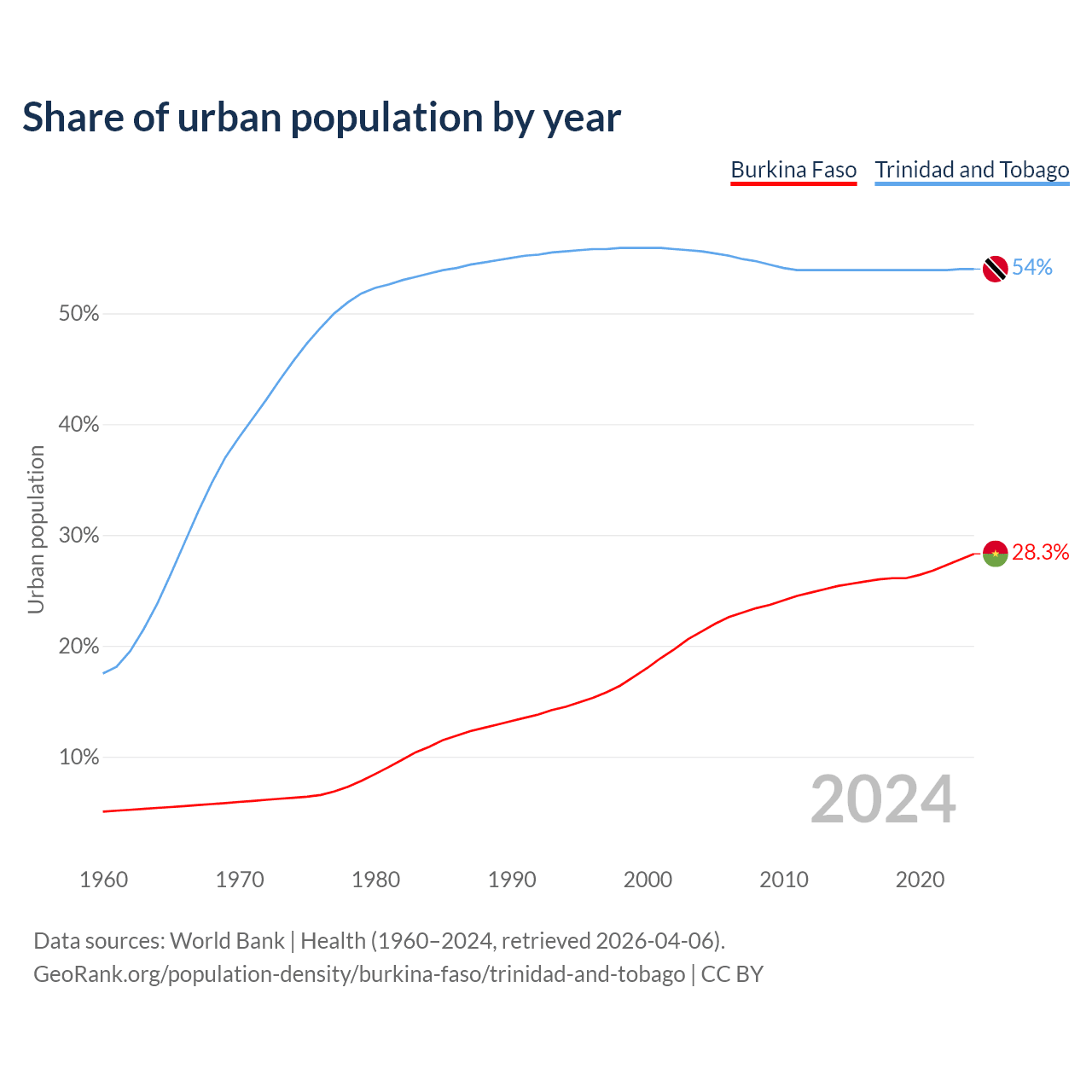 From 2004 to 2024, the share of urban population changed from 21.3% to 28.3% in Burkina Faso and from 55.6% to 54% in Trinidad and Tobago.