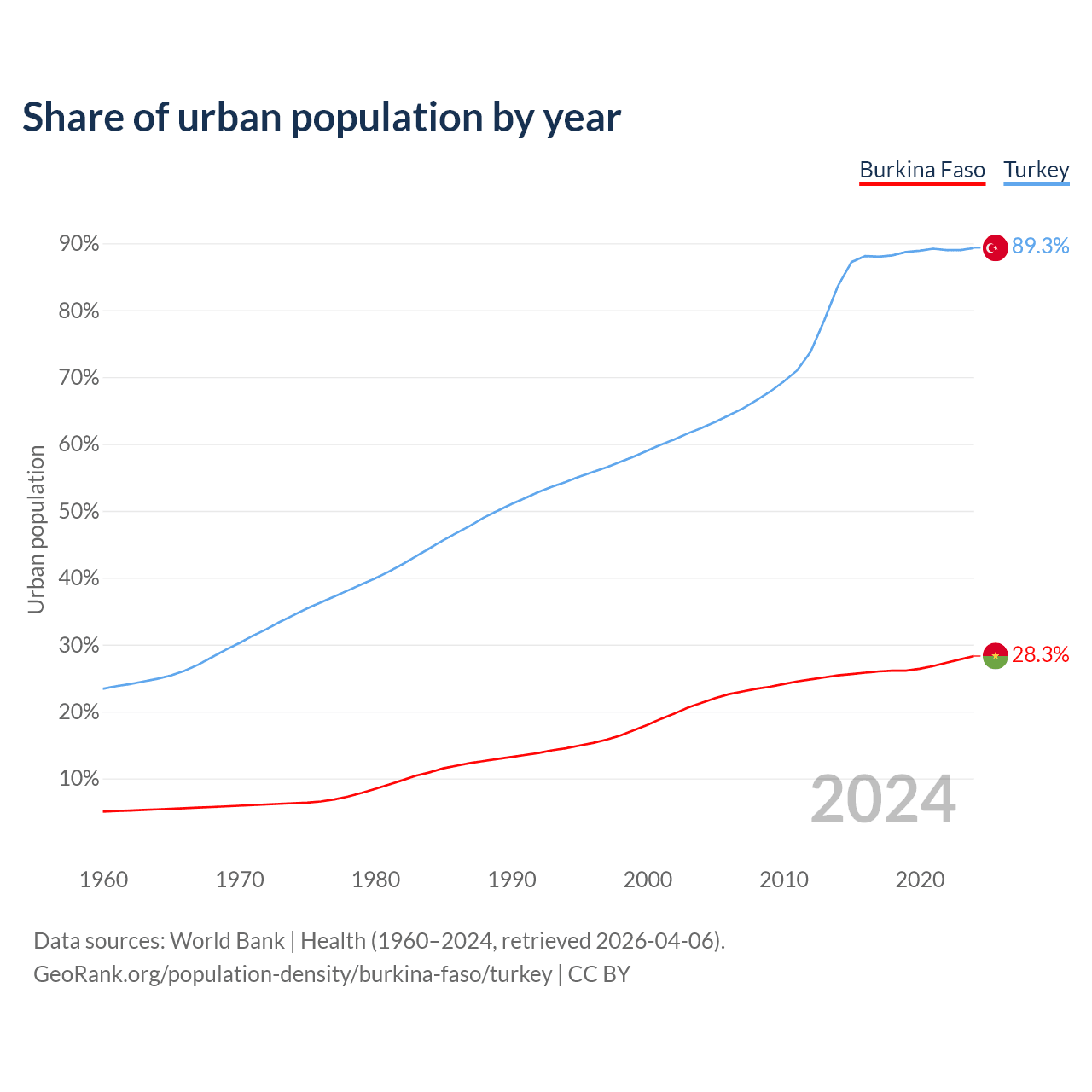 From 2004 to 2024, the share of urban population changed from 21.3% to 28.3% in Burkina Faso and from 62.4% to 89.3% in Turkey.