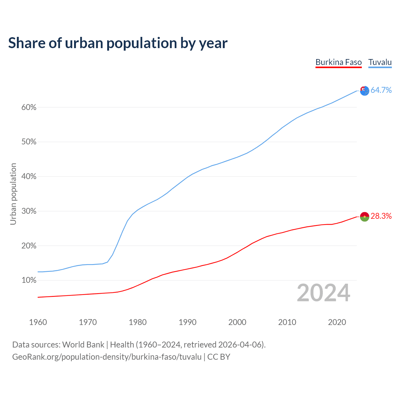 From 2004 to 2024, the share of urban population changed from 21.3% to 28.3% in Burkina Faso and from 48.4% to 64.7% in Tuvalu.