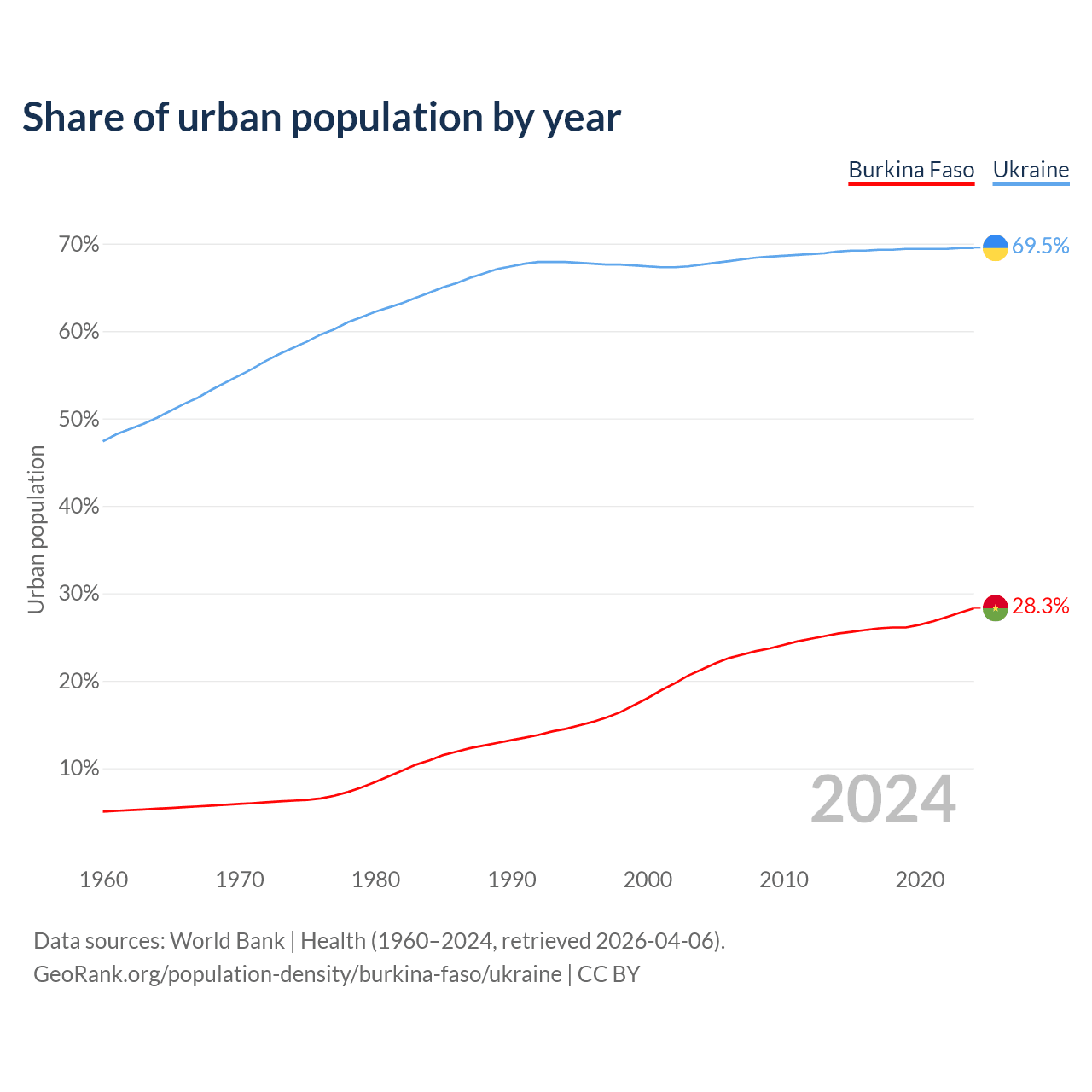 From 2006 to 2026, population density in Burkina Faso increased by 71.2%, compared to a 15.1% decline in Ukraine.