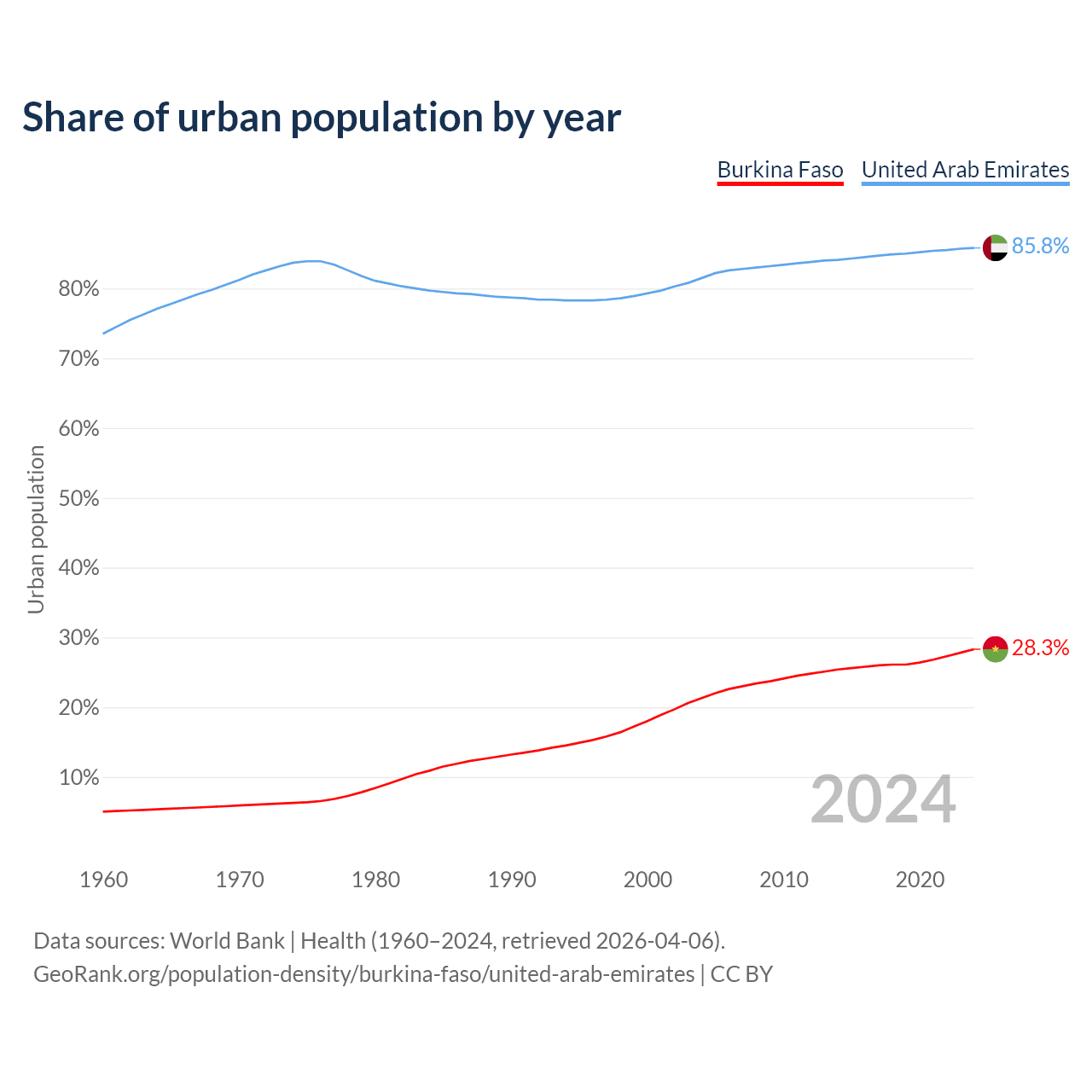 From 2004 to 2024, the share of urban population changed from 21.3% to 28.3% in Burkina Faso and from 81.5% to 85.8% in the United Arab Emirates.