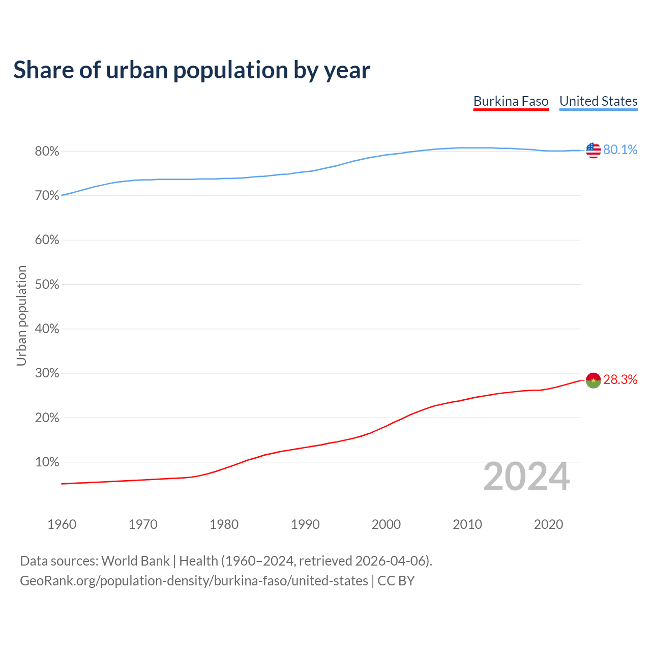 From 2004 to 2024, the share of urban population changed from 21.3% to 28.3% in Burkina Faso and from 80% to 80.1% in the United States.
