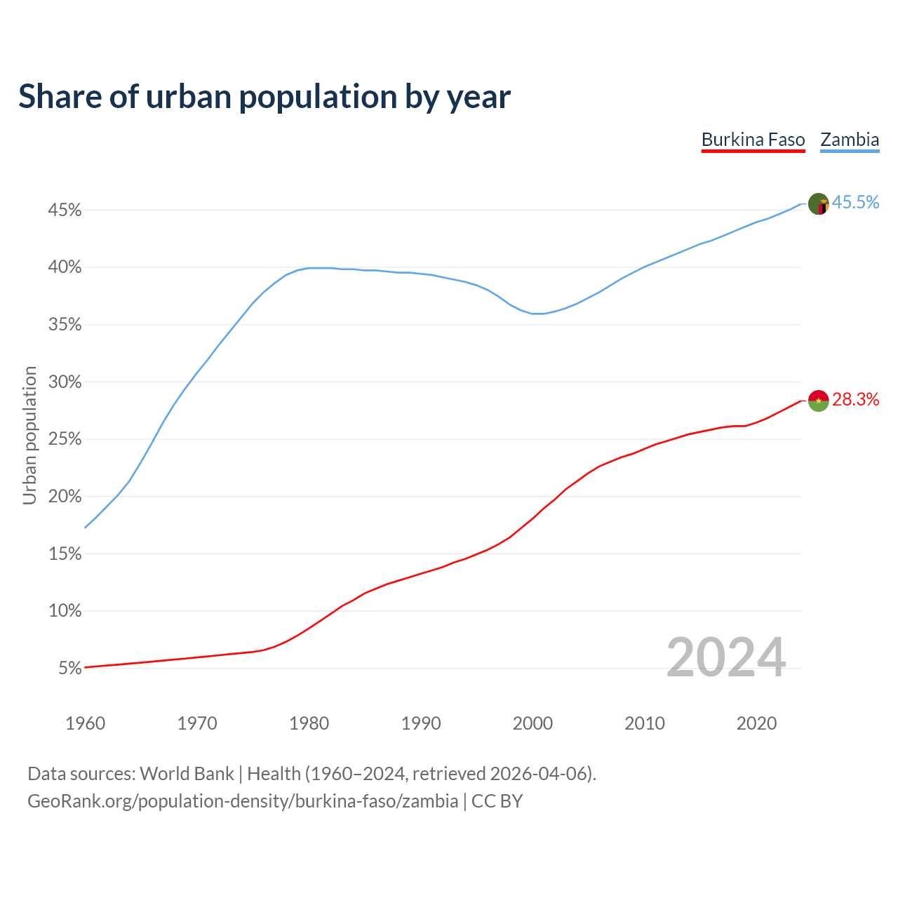 From 2004 to 2024, the share of urban population changed from 21.3% to 28.3% in Burkina Faso and from 36.8% to 45.5% in Zambia.