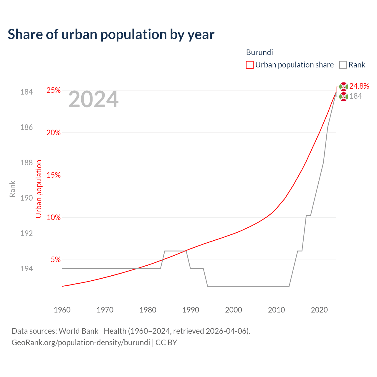 This chart shows the share of urban population in Burundi from 1960 to 2024: 1.84% lived in urban areas in 1960, 8.04% in 2000, and 24.8% in 2024.