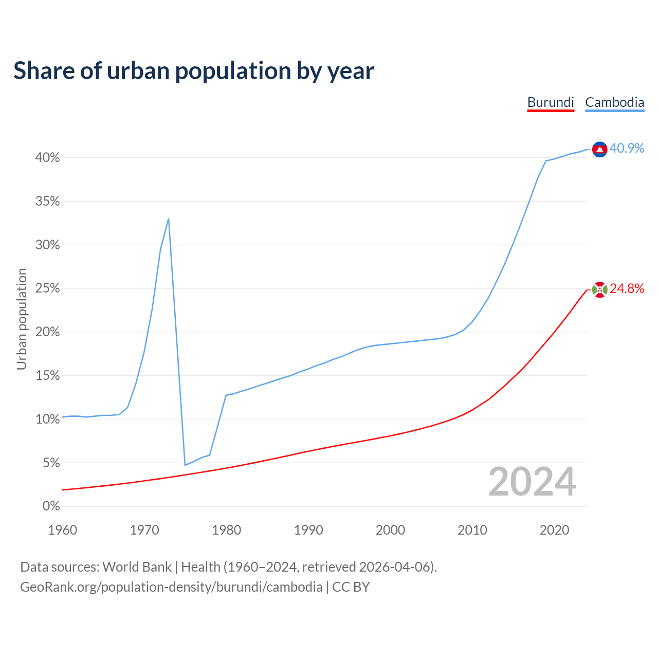 From 2004 to 2024, the share of urban population changed from 8.92% to 24.8% in Burundi and from 19% to 40.9% in Cambodia.