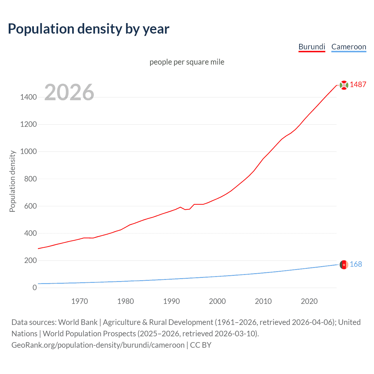 From 2006 to 2026, population density in Burundi increased by 87.4%, compared to a 74.7% growth in Cameroon.