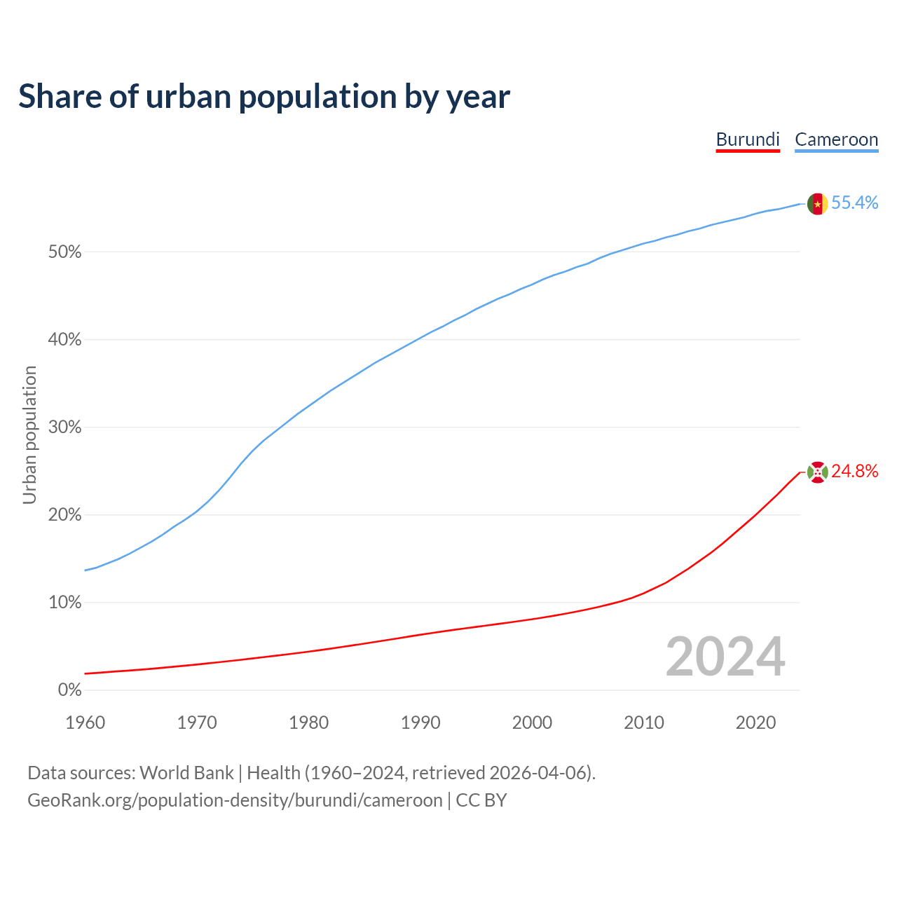 From 2004 to 2024, the share of urban population changed from 8.92% to 24.8% in Burundi and from 48.2% to 55.4% in Cameroon.