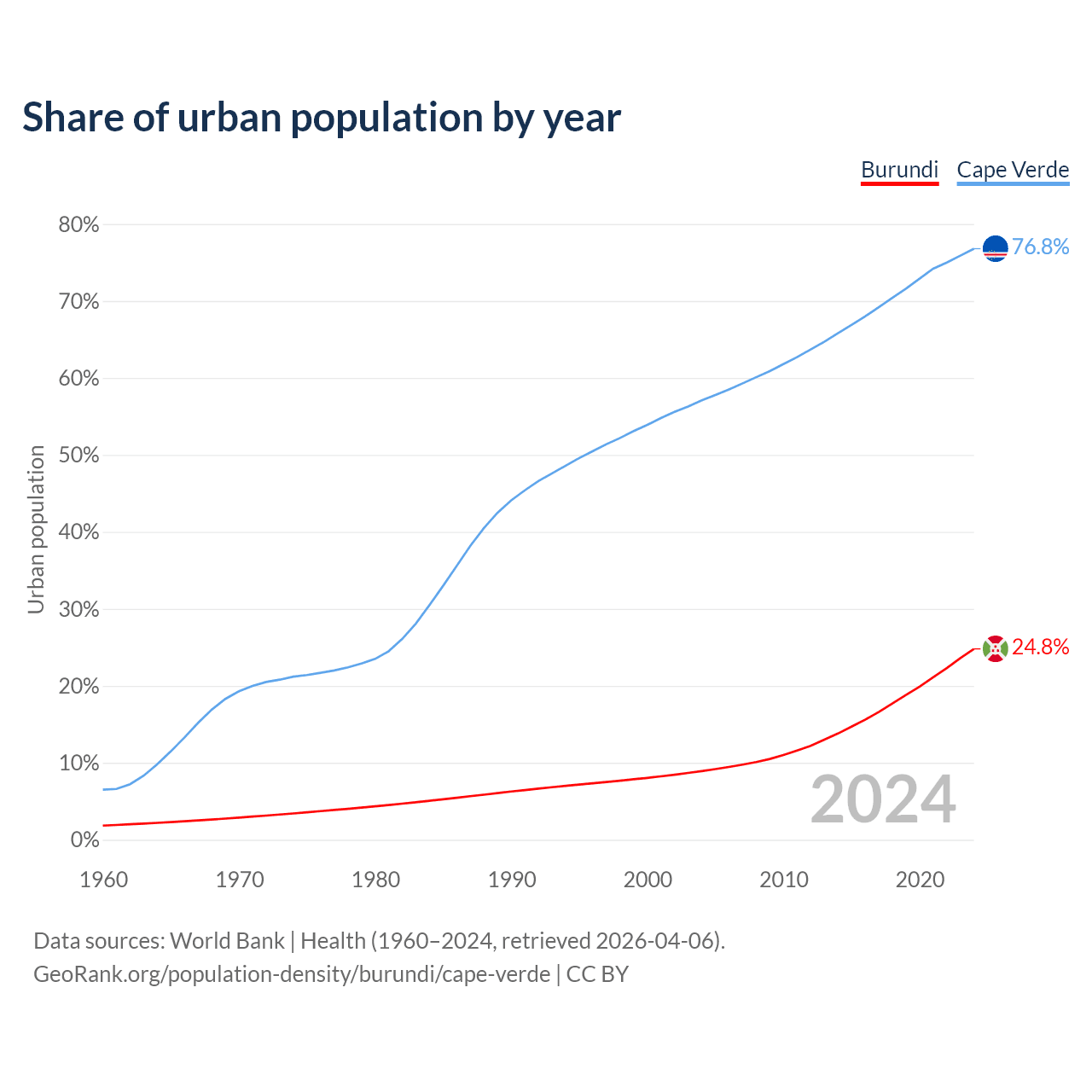 From 2004 to 2024, the share of urban population changed from 8.92% to 24.8% in Burundi and from 57.1% to 76.8% in Cape Verde.