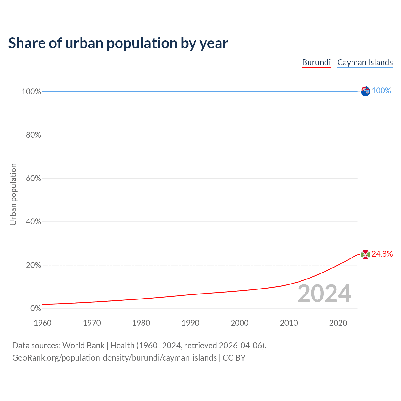 From 2004 to 2024, the share of urban population changed from 8.92% to 24.8% in Burundi and from 100% to 100% in the Cayman Islands.