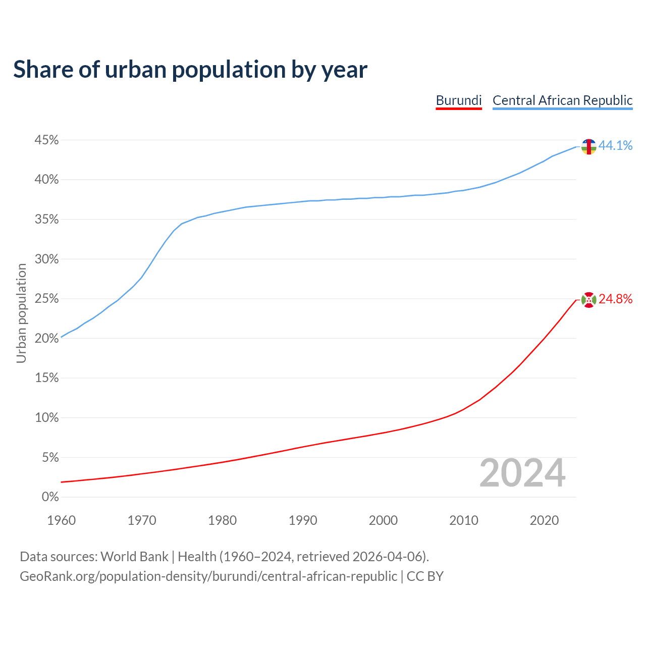 From 2004 to 2024, the share of urban population changed from 8.92% to 24.8% in Burundi and from 38% to 44.1% in the Central African Republic.