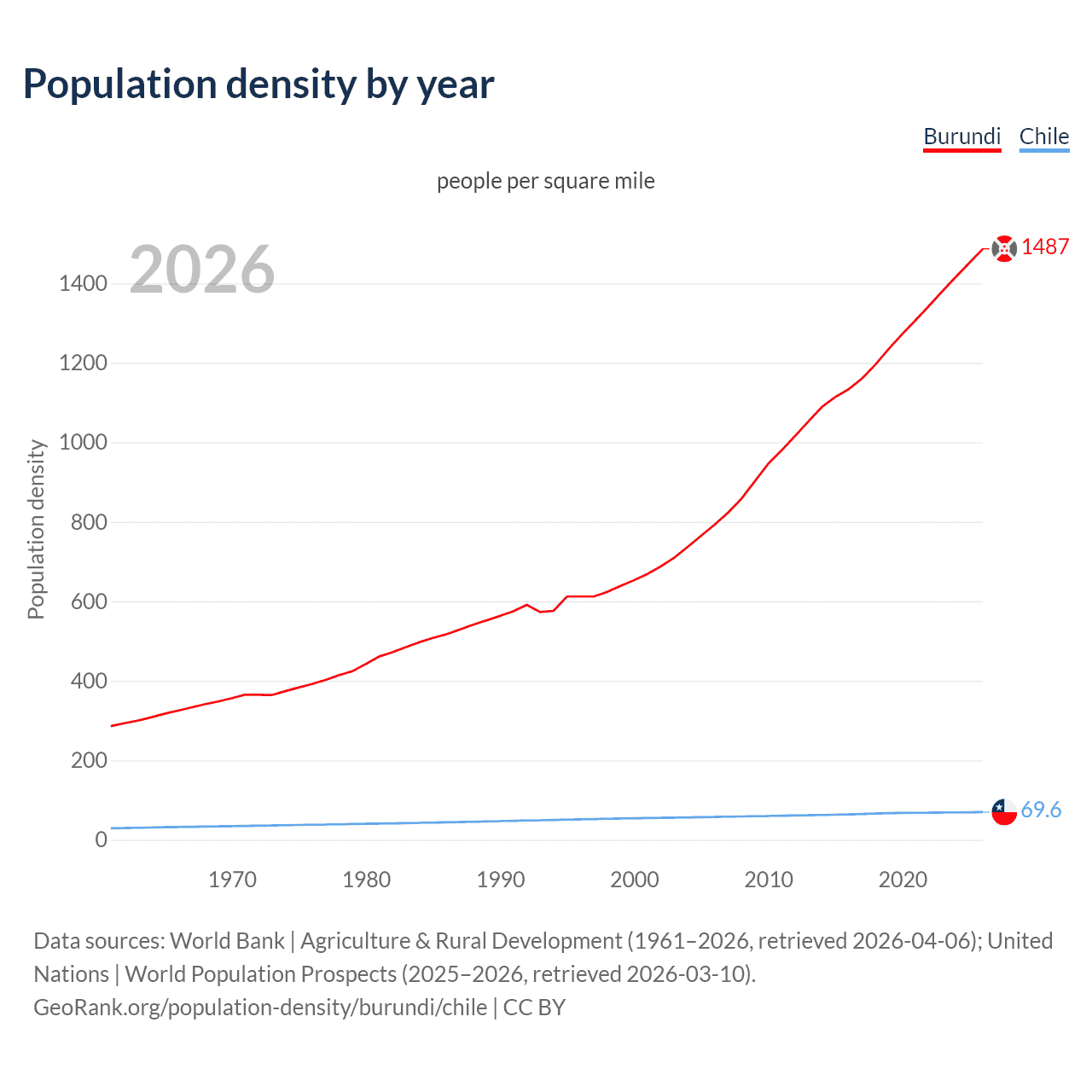 From 2006 to 2026, population density in Burundi increased by 87.4%, compared to a 21% growth in Chile.