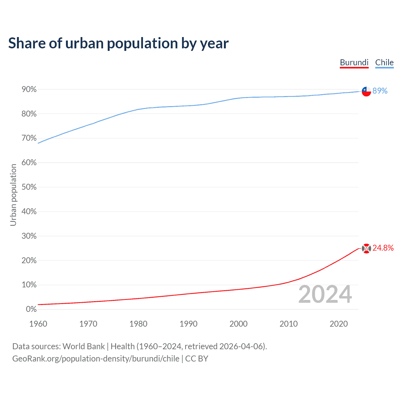 From 2004 to 2024, the share of urban population changed from 8.92% to 24.8% in Burundi and from 86.7% to 89% in Chile.