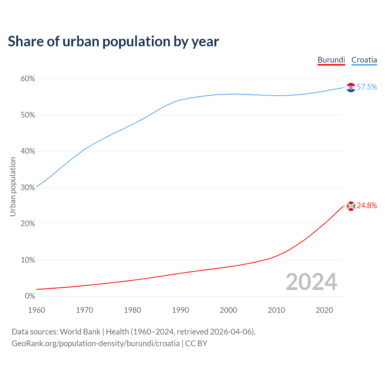 From 2004 to 2024, the share of urban population changed from 8.92% to 24.8% in Burundi and from 55.6% to 57.5% in Croatia.