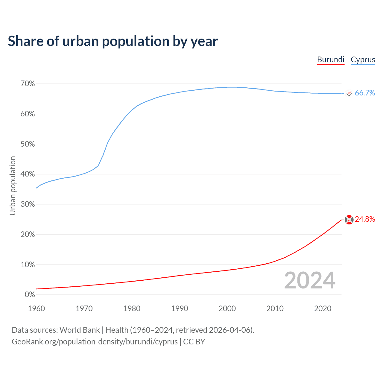 From 2004 to 2024, the share of urban population changed from 8.92% to 24.8% in Burundi and from 68.6% to 66.7% in Cyprus.