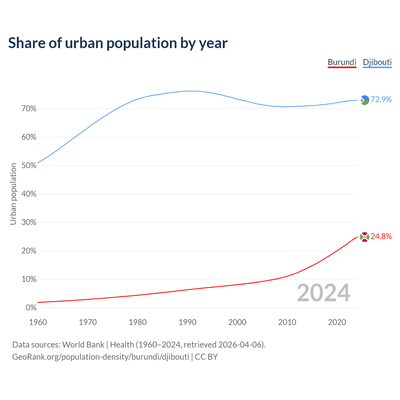 From 2004 to 2024, the share of urban population changed from 8.92% to 24.8% in Burundi and from 71.6% to 72.9% in Djibouti.