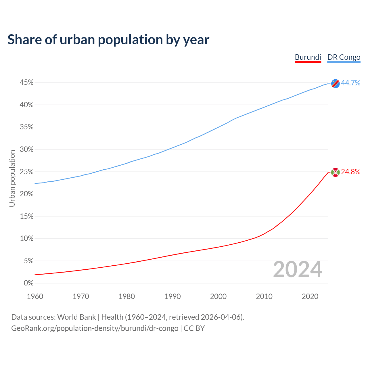 From 2004 to 2024, the share of urban population changed from 8.92% to 24.8% in Burundi and from 37% to 44.7% in the DR Congo.