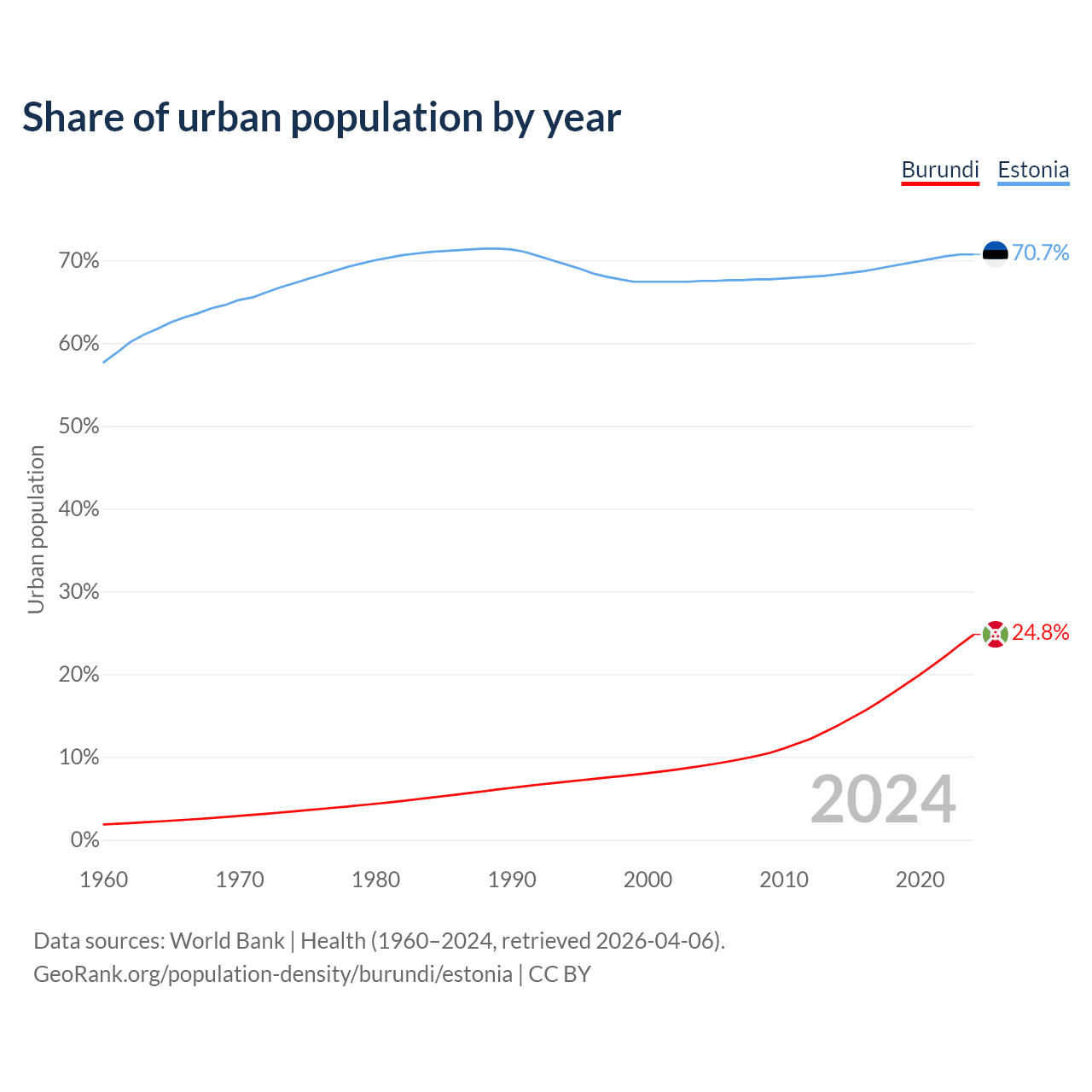 From 2004 to 2024, the share of urban population changed from 8.92% to 24.8% in Burundi and from 67.5% to 70.7% in Estonia.