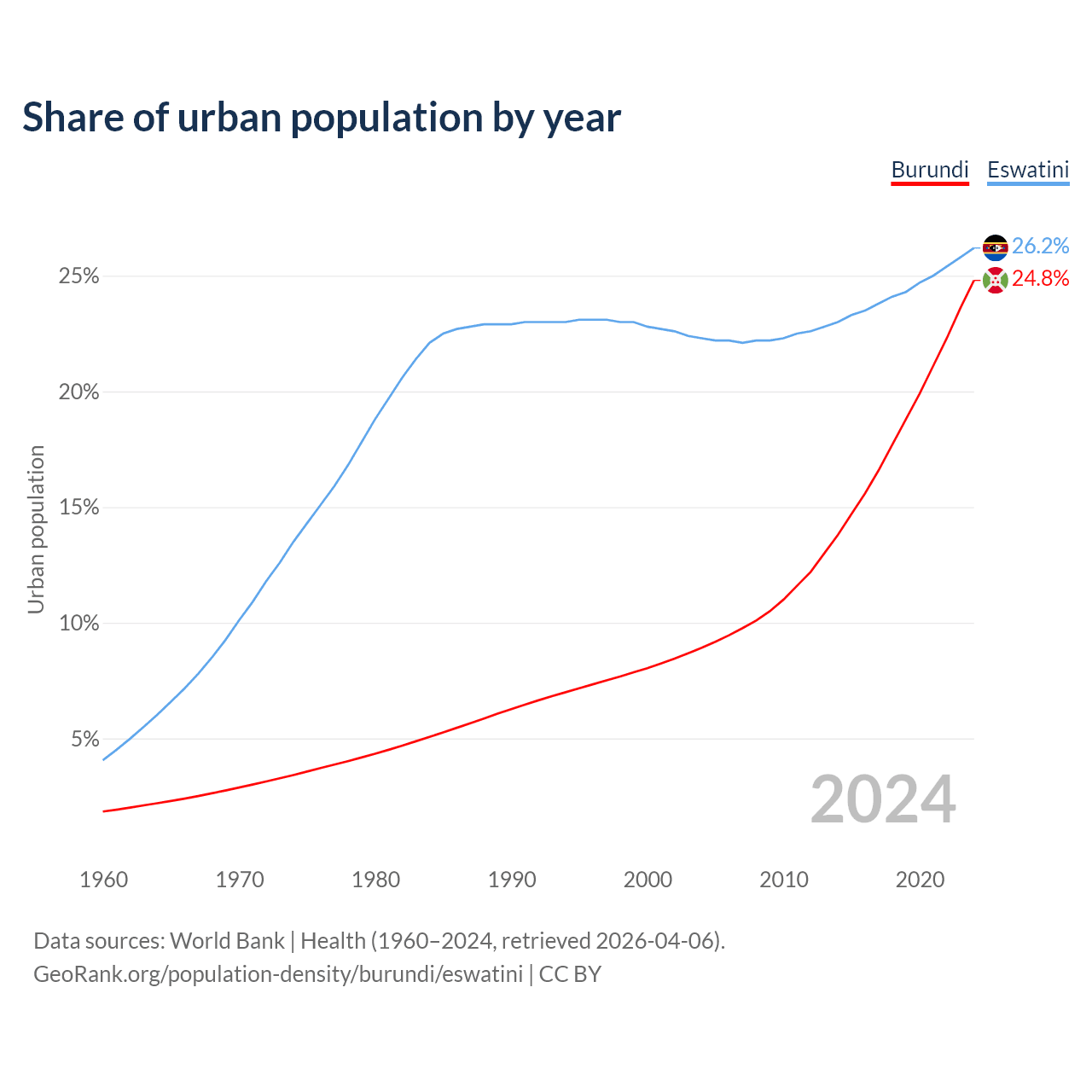 From 2004 to 2024, the share of urban population changed from 8.92% to 24.8% in Burundi and from 22.3% to 26.2% in Eswatini.