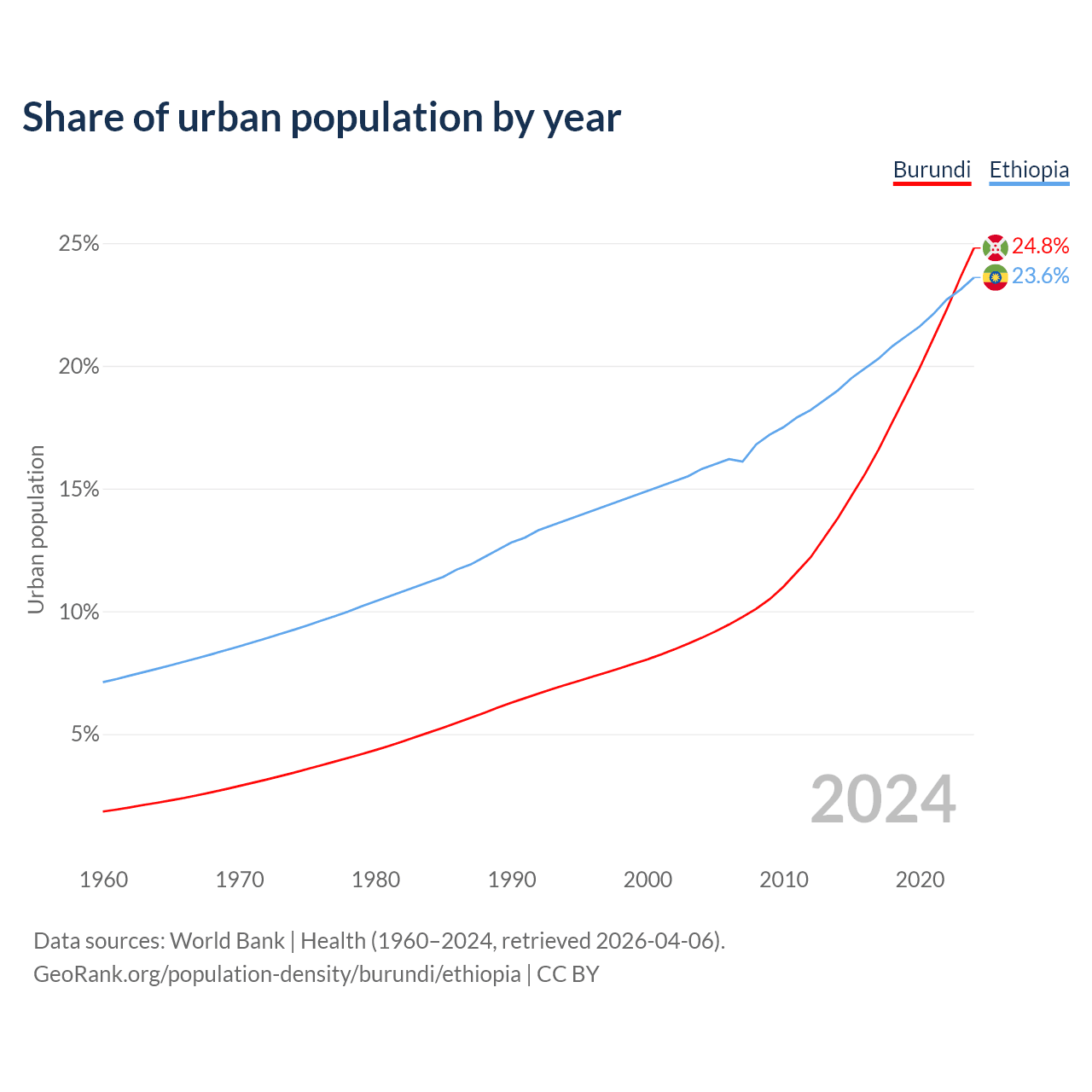 From 2004 to 2024, the share of urban population changed from 8.92% to 24.8% in Burundi and from 15.8% to 23.6% in Ethiopia.